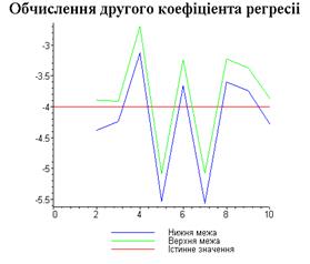 Програма повертає значення верхньої та нижньої меж інтервалів, які накривають коефіцієнти регресії. В результаті роботи цієї процедури ми отримали результати, обчислені у вигляді зручному для побудови графіка за цими даними.