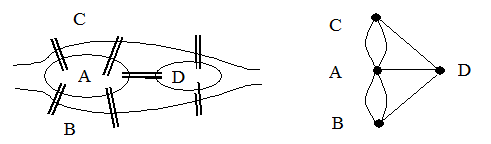 Если поставить в соответствие мостам ребра, а участкам суши — вершины, то получится граф (точнее псевдограф), в котором надо найти простой цикл, проходящий через все ребра. В общем виде эта задача была решена Эйлером в 1736 г.