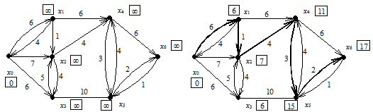 На рис. 2.1а изображен исходный помеченный граф и начальные значения li . На рис. 2.1б для того же графа указаны конечные значения li и выделен кратчайший путь. Пометка вершин графа происходила в следующем порядке (в скобках указана дуга, вдоль которой выполняется (1)):