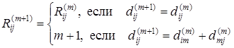 Отметим, что алгоритм Флойда непосредственно не указывает сам кратчайший путь между вершинами, а только его длину. Алгоритм Флойда можно модифицировать таким образом, чтобы можно было находить и сами пути. Для этого получим вспомогательную матрицу [Rij ], которая будет содержать наибольший номер вершины некоторого кратчайшего пути из xi в xj (Rij =0, если этот путь не содержит промежуточных вершин).