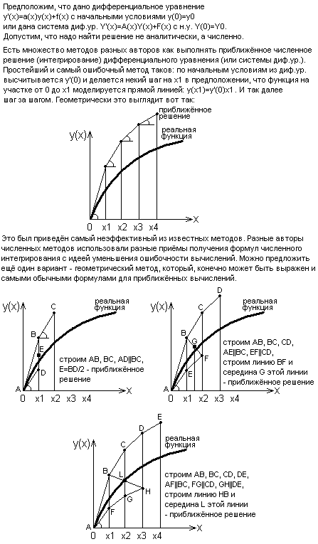 Читали нам как-то в бауманке численные методы решения дифференциальных уравнений. И, кажется, приводили аналитический вывод формул одного из авторов. Или это просто мелькнуло в учебнике (я имею в виду вывод формул). Уже не очень помню. Запомнилась только собственная мысль, что людям вообще-то проще всего даются геометрические аналогии и выводы, сделанные на основе понятных геометрических картинок. Ну, вот тогда я и нарисовал один из вариантов численного решения дифференциальных уравнений и помню даже перевёл геометрические картинки в буквенные формулы приближённых вычислений. Сейчас повторно выводить буквенные формулы для численного интегрирования дифференциальных уравнений мне не кажется интересным. А вот привести картинки тех студенческих мыслей вполне можно для обсуждения.
