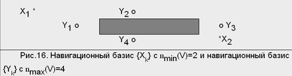 Для стандартного террайна множество вершин Р является навигационным множеством по крайней мере четвертого порядка. Пусть nmin(V) и nmax(V) соответствуют минимальной и максимальной возможным размерностям (числу элементов) для навигационного базиса. Очевидно, что эти два числа могут быть различны (см. рис.1).