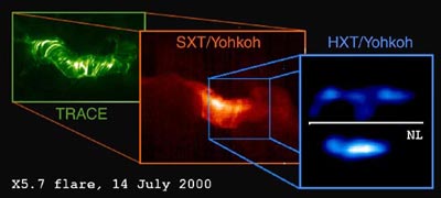 Рис. 1 - Солнечная вспышка (рентгеновский балл Х5.7), зарегистрированная 14 июля 2000 г. со спутников "TRACE" и "Yohkoh". Видна аркада вспышечных петель: слева в УФ (195 А); в центре - в мягком рентгеновском излучении; справа - источники жесткого рентгеновского излучения (53 - 94 кэВ), расположенные вдоль вспышечных лент - основания аркады. NL - фотосферная нейтральная линия.