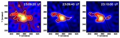 Рис. 5 - Вспышки 15 апреля 2002 г. Изображения получены рентгеновским телескопом на спутнике "RHESSI" в диапазоне энергий 10-25 кэВ, который соотвествует тепловому излучению сверхгорячей плазмы: