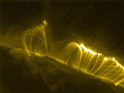 Рис. 6 - Гигантская солнечная вслышка (рентгеновский балл Х17) 4 ноября 2003 г. Прекрасно видна аркада вспышечных петель в короне. Изображение в линиях крайнего ультрафиолетового излучения 171 А получено с помощью УФ-телескопа КА "ТRACE".