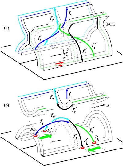 а) магнитные линии f1 и f1' ближе всего расположены к токовому слою (RCL).