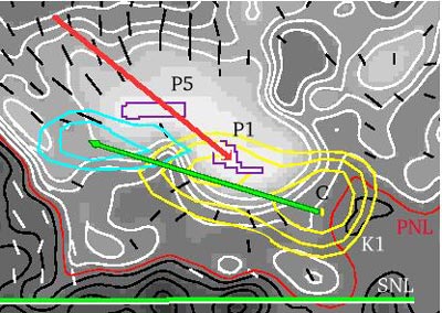 Рис. 9 - Вспышка (рентгеновский балл X5.7) 14 июля 2000 г. Показано положение наиболее яркого источника излучения, К1, в диапазоне 53-93 кэВ, по данным жесткого рентгеновского телескопа HXT на спутнике "Yohkoh" в начале (желтые контуры) и в конце (голубые контуры) всплеска жесткого рентгеновского излучения. Зеленая стрелка - смещение центроида излучения С, за время всплеска порядка 20 с. Красной стрелкой показано движение самого большого солнечного пятна Р1 в течение двух дней, предшествовавших вспышке. Оно складывается из двух частей: движение к упрощенной нейтральной линии SNL и движение вдоль нее.