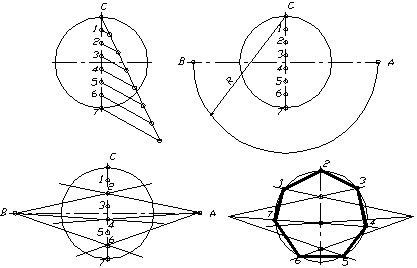 На рисунку 1.11 наведений приклад ділення кола на чотири та вісім рівних частин. Точки 1, 3, 5, 7 ділення кола на чотири частини одержують в перетині осьових ліній із заданим колом. Для визначення положення точок 1, 4, 6, 8 застосовують спосіб ділення кута навпіл (рис. 1.9).
