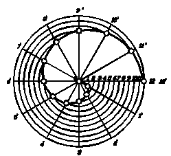 Точки спіралі лежать на перетині радіальних променів, що сполучають точкиподілу кола та його центр, і дуг кіл, проведених через відповідні точки поділу кроку спіралі.