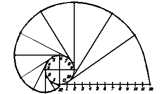 Для побудови спіралі Архімеда (рисунок 1.16) за заданим її кроком (величина кроку дорівнює відрізку 0 11) необхідно з точки 0 провести коло, радіус якого дорівнює кроку. Поділити коло та крок на довільну кількість рівних частин: точки 11 -111 – це точки ділення кола, а точки 1 – 11 – точки ділення кроку.