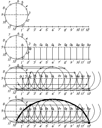 Циклоїдами називають криві, які є траєкторією руху точки кола, що без ковзання котиться по прямій або кривій. Вихідними даними для побудови циклоїди є коло певного радіуса. На рисунку 1.18 наведений приклад побудови циклоїди.