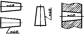 Перед розмірним числом, яке визначає конусність, ставлять знак конусності, гострий кут якого спрямований у бік вершини конуса. Розмір конусності можна ставити над осьовою лінією або на поличці лінії-виноски. Різні варіанти нанесення на кресленні конусності наведені на рисунку 1.45.