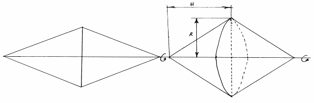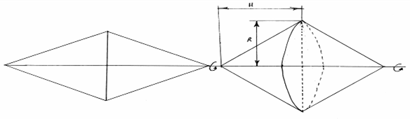 Для нахождения радиусов и высот элементов, из которых состоит тело вращения, воспользуемся теоремой о линиях пересечения цилиндрической и гиперболической поверхностей вращения.