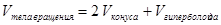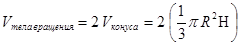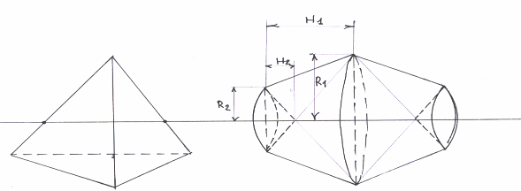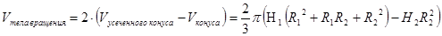 В результате вращения образуется тело вращения, состоящее из двух усеченных конусов с общим основанием. Причем, в каждом из них «вырезается» конус при меньшем основании (см. рис.). Таким образом,