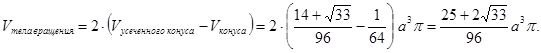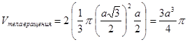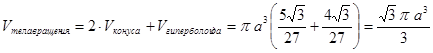 При вращении тетраэдра относительно оси, проходящей через среднюю линию грани тетраэдра, получается тело вращения, объем которого равен ![]()