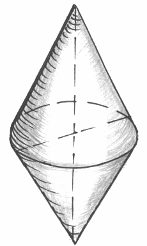 В данном случае прямые (образующие поверхности) пересекают ось вращения, значит, в результате вращения получаются конические поверхности с общим основанием.