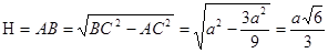 Для вычисления высоты конуса (Н) рассмотрим прямоугольный треугольник АВС, в котором гипотенуза ВС – ребро тетраэдра – по условию равна а. Катет АВ – это радиус окружности описанной около равностороннего треугольника со стороной а, следовательно,