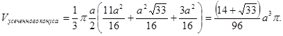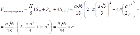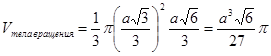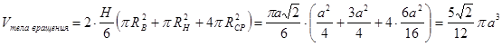 При вращении тетраэдра относительно оси, проходящей через центр грани и противоположную вершину (т.е. через высоту тетраэдра), получается тело вращения, объем которого равен![]()