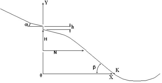 , равный согласно принятым нормам от -25О до -40О, и участка торможения. Участок торможения как правило имеет профиль, плавно закругляющийся вверх. Расстояние по горизонтали от канта отрыва - крайней точки стола отрыва - до точки максимальной дальности обозначается