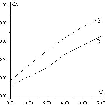 В заключение приводится сравнение реальных аэродинамических коэффициентов прыгунов 60-х и нашей оценки. Криаая А на рис. 6 изображает полученную нами зависимость между коэффициентом подъемной силы и коэффициентом лобового сопротивления, а кривая В - аналогичную зависимость, полученную из экспериментальных зависимостей аэродинамических коэффициентов от угла атаки [1]. Видно, что вид зависимости коэффициентов друг от друга слабо отличается, и коэффициент подъемной силы в нашей работе выше, чем в