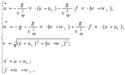 Следует также помнить, что воздушная среда находится в движении, в воздухе вокруг трамплинной горы задано векторное поле скоростей ветра. То есть все предыдущие уравнения записаны для относительных скоростей и их следует переписать для абсолютных скоростей.