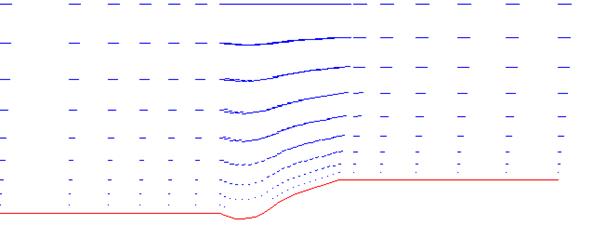 10-4 Па). Скорость ветра на верхней границе составила примерно 11 м/с, а на высоте, где обычно летают лыжники - около 5 м/с, что вполне согласуется с приведенными выше опытными данными. Видно, что во входном и в выходном участках области скорость ветра строго горизонтальна, а в районе горы имеет вертикальную составляющую, так как воздушный поток огибает гору.