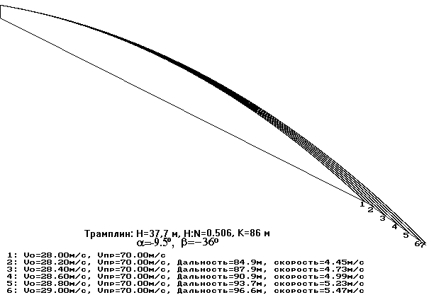 Рис.10. Траектории полета лыжника при различных скоростях вылета