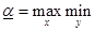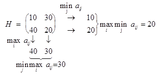т.е. определяется max выигрыш игрока 1, при условии, что игрок 2 применит свою j -ю чистую стратегию, затем игрок 2 отыскивает такую свою j = j1 стратегию, при которой игрок 1 получит min выигрыш, т.е. находит