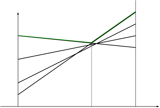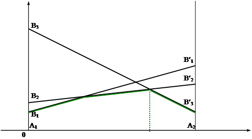Решение . Матрица имеет размерность 2 х 4. Строим прямые, соответствующие стратегиям игрока 1. Ломанная А1 K А¢4 соответствует верхней границе выигрыша игрока 1, а отрезок NK –цене игры. Решение игры таково