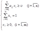 Итак, пусть дана матричная игра с матрицей А порядка mх n. Согласно свойству 7 оптимальные смешанные стратегии х = (х1 , ..., х m ), y = (y1 , ..., yn ) соответственно игроков 1 и 2 и цена игры u должны удовлетворять соотношениям.