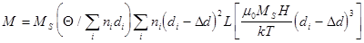 В первых экспериментальных работах было получено хорошее согласие кривых намагничивания с функцией Ланжевена [10,12]. Некоторое отклонение хорошо устраняется учетом распределения частиц по размерам. Так, использование в качестве функции распределения формулы Гаусса дало возможность представить зависимость намагниченности от поля в виде [10]: