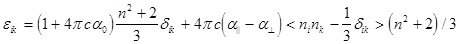 где единичный вектор n направлен вдоль выделенного направления частицы, а a|| и a^ - параллельная и поперечная (по отношению к n) компоненты поляризуемости частицы в электрическом поле световой волны. В этом случае изотропная часть тензора диэлектрической проницаемости может быть представлена в виде [3]: