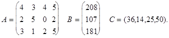 1. Сформулировать линейную производственную задачу и составить ее математическую модель, взяв исходные данные из приложения 1, где технологическая матрица А затрат различных ресурсов на единицу каждой продукции, вектор объемов ресурсов В и вектор удельной прибыли С при возможном выпуске четырех видов продукции с использованием трех видов ресурсов