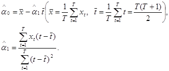 Выполнив расчеты на ЭВМ с помощью указанных ППП, либо непосредственно подставив значения временного ряда ВВП (взятые из таблицы) в последние две формулы, получаем оценки коэффициентов тренда