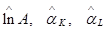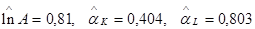 Вводя в программу линейной множественной регрессии в качестве значений зависимой переменной логарифмы ВВП (ln X t , t = 1,…,T ), а в качестве значений двух переменных логарифмы ОПФ (ln K t , t = 1,…,T ) и числа занятых (ln L t , t = 1,…,T ), получаем в результате работы программы оценки параметров регрессии