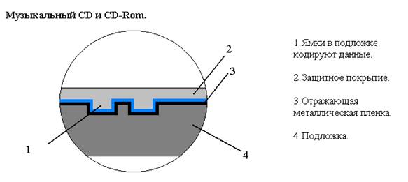 CD-DA (Compact Disk - Digital Audio- цифровой звук), по принципу действия, совпадает с вышеописанным примером, т.е. годится только для чтения данных, записанных на него производителем.