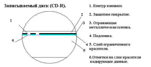 Этот последний недостаток побудил производителей на поиски технологии записываемых CD. Так появился CD-R (Compact Disk- Recordable - записываемый). Носители типа CD-R могут быть записаны самим пользователем на специальном CD-R-приводе. В основном здесь применяются технологии, основанные на изменении отражающих свойств вещества подложки компакт-диска под действием луча лазера. У СD-R четыре слоя, а не три как у обычного CD (см. рис.2). Лазеры в устройствах CD-R работают на трех или более уровнях мощности. На самом низком уровне свет лазера может только определять наличие или отсутствие выемок или отметок на записывающей поверхности – читать диск. А на самом высоком уровне он сам может прожигать отметки на этой поверхности. Записываемые диски можно записывать только один раз, это определяется технологией записи этих дисков. Можно сделать выемки на поверхности диска, но после этого, конечно, нельзя их удалить. Кстати, заметим, что записываемые компакт-диски в несколько раз дороже обычных CD. Дело в том, что в качестве светоотражающего слоя в них используется уже не алюминий, а золото. Между прочим, подобные компакт-диски обычно служат как мастерные для дальнейшего тиражирования. Тем не менее, в ряде случаев CD-R-диски можно использовать и для долговременного архивирования какой-либо ценной информации. Заметим, что читать CD-R диск можно и на обычном приводе, но, разумеется, только первый сеанс записи. Когда смотришь на не полностью записанный CD-R, область с информацией выглядит более темной и она легко различима.