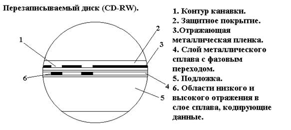 Как бы небыли хороши CD-R, их нельзя использовать несколько раз. Возможность перезаписи информации на диске становилась все более актуальной и по этому учеными была создана более сложная версия CD. Диск CD-RW содержит на два слоя больше чем CD-R. Но технология записываемого слоя основана на сплаве нескольких металлов.Этот сло формируется из неких кристалов, хорошо отражающих свет.