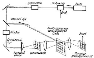 .Объектом записи в вычислительной технике обычно является. ‘Двумерная матрица двоичных знаков. При записи информации луч лазера с помощью системы зеркал разделится на два: сигнальный, проходящий через запоминаемый объект, и опорный. Направление опорного луча управляется дефлектором — устройством, состоя-