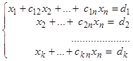 Така система має незліченну множину розв’язків. Щоб знайти їх, у всіх рівняннях системи члени з невідомими хk+1. , xk переносять в праву частину. Ці невідомі називаються вільними і надають їм довільні значення. З отриманої трикутної системи знаходимо х1 ., xk, які виражатимуться через вільних невідомих.