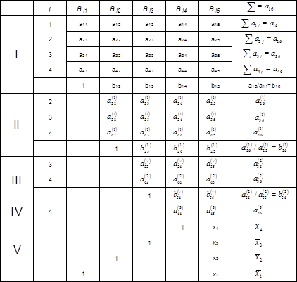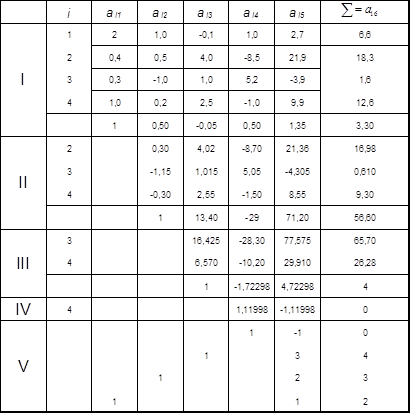 1) Записуємо коефіцієнти даної системи в чотирьох рядках і п’яти стовпцях розділу І таблиці 1.