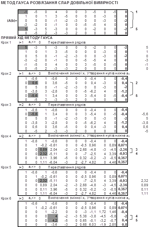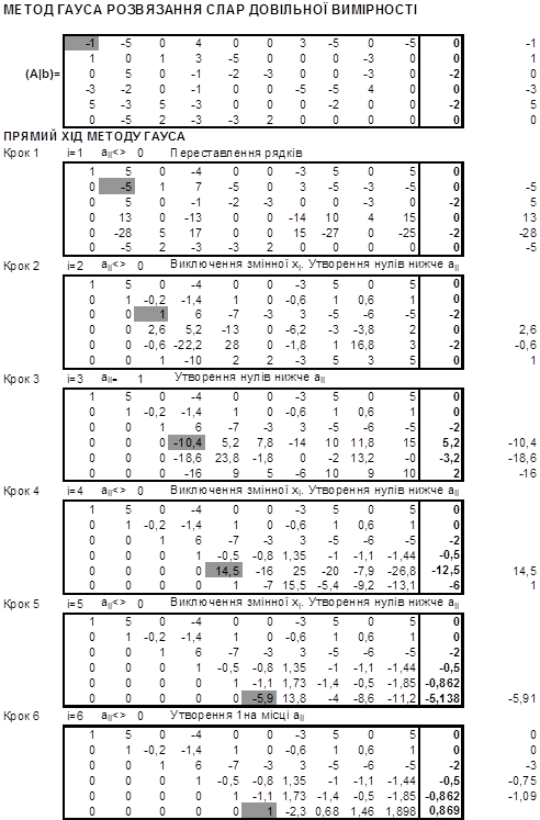 - Збереження результатів програми у файл з послідовним описом кожного виконаного кроку (виключення змінної з розгляду та утворення нулів нижче-вище розв’язувального елемента; переставлення рядків)