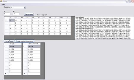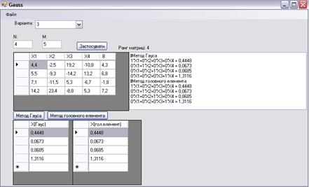 Дана програма реалізована в інтегрованому середовищі програмування Visual Studio 2008 SP1 мовою програмування С#. Вона дозволяє розв’язувати систему лінійних алгебраїчних рівнянь методом Гауса, записаних в матричній формі, а також методом з пошуком головного елемента, при чому матриці можуть будь-якою вимірністю mxn (m і n – кількість стовпчиків та рядків матриці відповідно). Також ще однією з можливостей програми є обчислення рангу матриці.