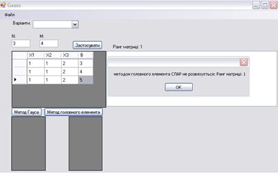 Зауваження 2. Якщо вибране нами СЛАР розв’язку немає, то на екрані з’явиться повідомлення, в якому буде сказано, що методом Гауса розв’язку ми отримати не зможемо, а також буде вказано, який саме ранг буде мати дана матриця (малюнок 6).