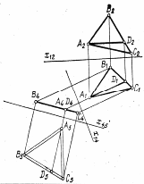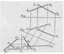 На Мал. 4 показано визначення натуральної величини трикутного відсіку подвійною заміною площин проекцій. Для цього в площині трикутника спочатку проведено горизонталь