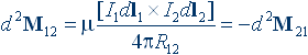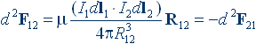 Силы взаимодействия двух проводников длиной dl1 и dl2 с токами, соответственно, I1 и I2 равны:
