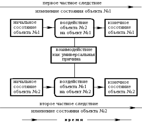 Нетрудно видеть, что при взаимодействии оба объекта одновременно воздействуют друг на друга (взаимность действия). При этом происходит изменение состояния каждого из.взаимодействующих объектов. Нет взаимодействия – нет изменения состояния [8]. Поэтому изменение состояния какого-либо одного из взаимодействующих объектов можно рассматривать как частное следствие причины – взаимодействия. Изменение состояний всех объектов в их совокупности составит полное следствие.