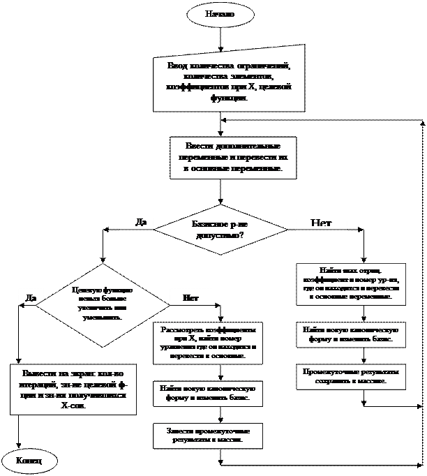 В процессе расчета задачи ОЗЛП может получиться один или несколько отрицательных свободных членов, это означает, что полученное решение не является опорным, соответственно не может быть оптимальным. Рассмотрим случай, когда среди свободных членов есть отрицательный. Для того, чтобы избавиться от них необходимо пересчитать таблицу обмена базисных и свободных переменных пока не придем к опорному решению или не убедимся в том, что решение не существует. Необходимо так обменивать базисные и свободные переменные, чтобы эта процедура приближала к области допустимых решений, чтобы число отрицательных свободных членов убывало или по крайне мере убывали их абсолютные величины.