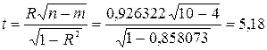 Розрахункое значення t-статистики порівнюється за абсолютною величиною з табличним t10-4 = 1,943. Оскільки розрахункове значення більше, коефіцієнт кореляції є статистично значущим.