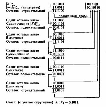 Если умножение выполняется путем многократных сдвигов и сложений, то деление, будучи операцией обратной умножению,— путем многократных сдвигов и вычитаний.